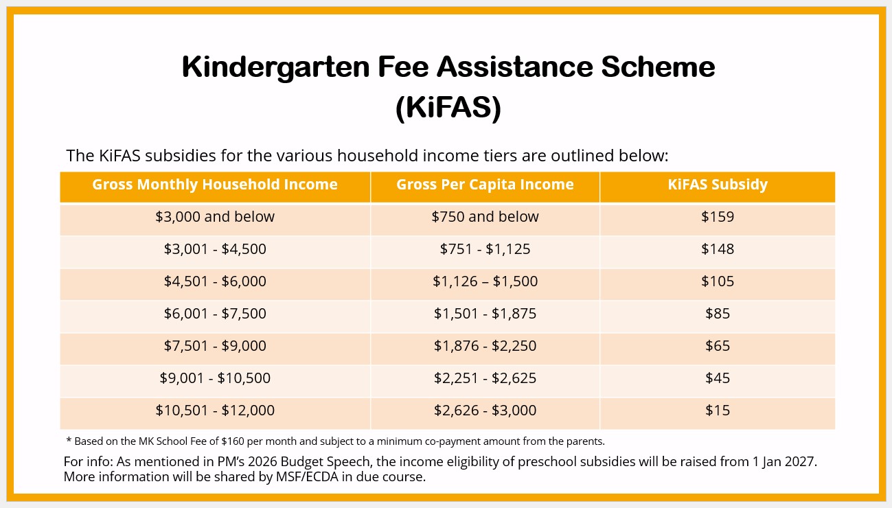 If your child is a Singapore Citizen, they may qualify for financial assistance under the Kindergarten Fee Assistance Scheme (KiFAS). KiFAS is provided by the Early Childhood Development Agency (ECDA) and applies only to MK school fees.