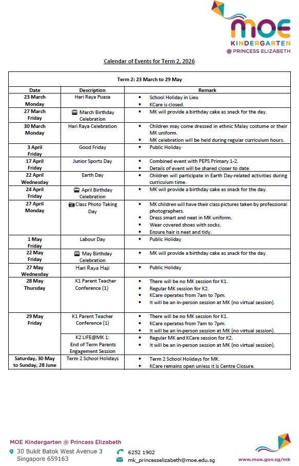 Children attending MK@ Princess Elizabeth should look smart by wearing well-fitted MOE Kindergarten Uniform, socks, and fully covered shoes for their daily lessons. Please purchase your child/ward's uniforms directly from the following suppliers via the website or retail outlets. Do make an appointment before visiting the store and check on availability of sizes beforehand.
